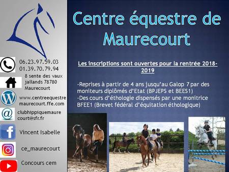 Le Centre Equestre de Maurecourt accueille les cavaliers dès l'âge de 4 ans et pour tous. Les cavaliers peuvent profiter de notre carrière, notre manège, notre club house et de nos balades dans un environnement naturel. Des cours d'éthologie avec une monitrice diplômée BFEE éthologie vous sont proposés. N'hésitez pas à nous contacter !